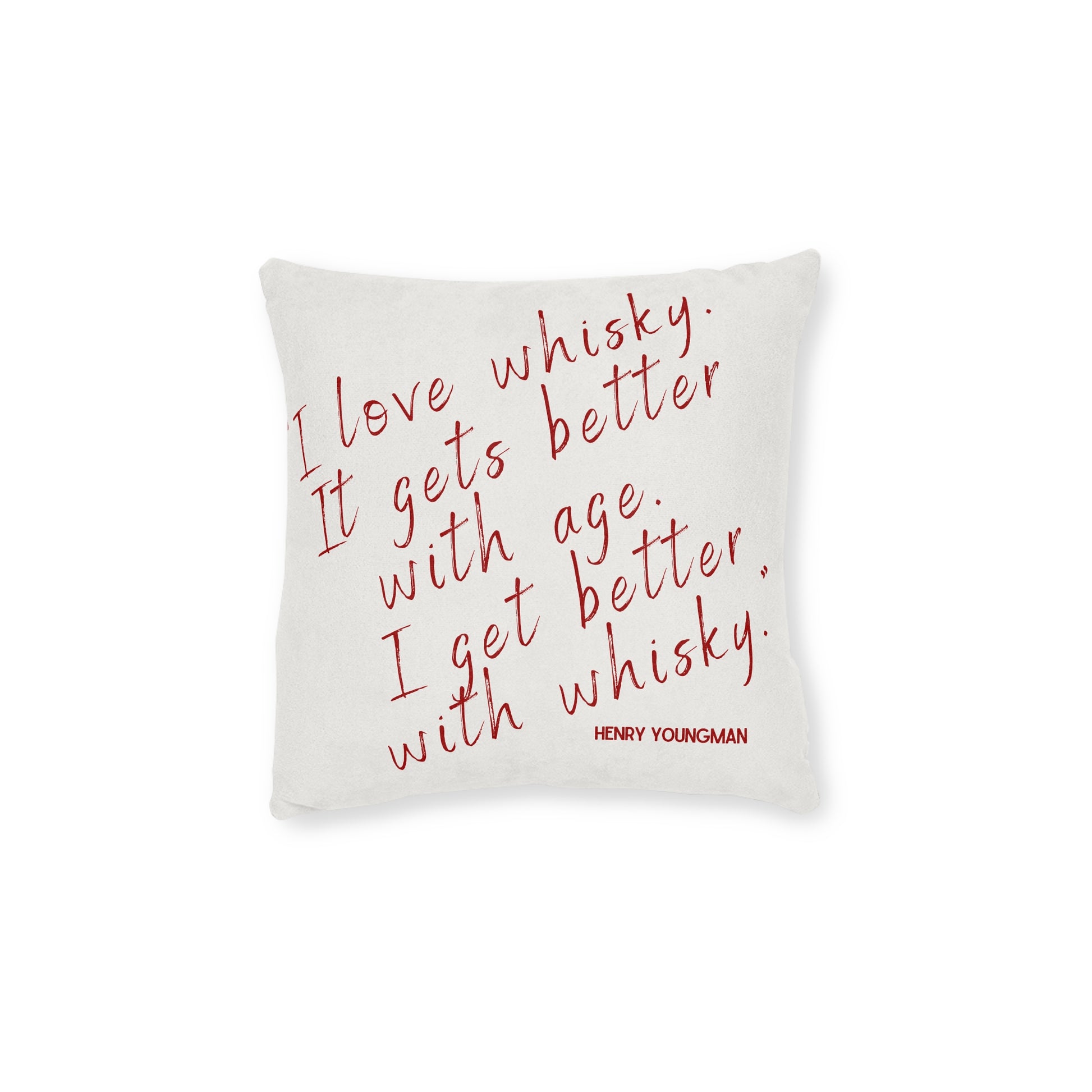 Add a touch of character, humour, and vintage charm to your space with this Whisky Lover Pillowcase featuring Henry Youngman’s classic line: “I love whisky. It gets better with age. I get better with whisky.”